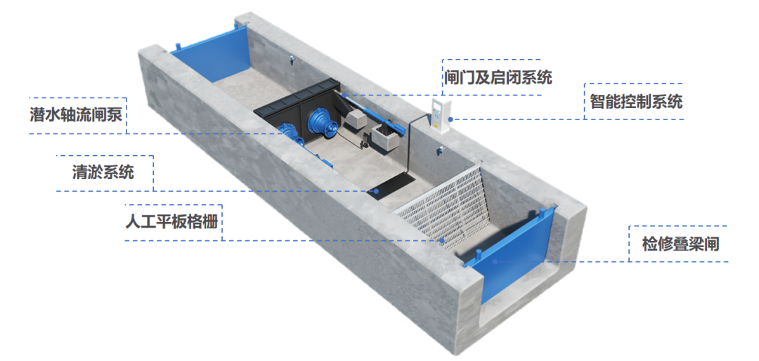 凱泉一體化泵閘將水泵和閘門(mén)合二為一,集成水泵、閘門(mén)、啟閉系統(tǒng)、拍門(mén)、攔污系統(tǒng)、液位監(jiān)控、檢修系統(tǒng)、智能控制等多種附屬設(shè)施為一體,無(wú)需占用額外土地面積,不影響河道行洪,生態(tài)環(huán)境友好。在本次項(xiàng)目中具有以下優(yōu)勢(shì):