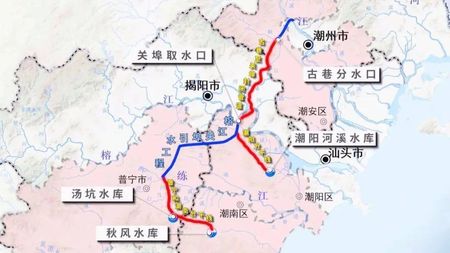 該項(xiàng)目工程包括古巷分水口至關(guān)埠取水口封閉管道主干線、潮陽分干線、普寧和潮南分干線三部分,建設(shè)內(nèi)容主要包括輸水線路全長約71.652km,泵站1座。其中,位于揭陽市普寧市下架山鎮(zhèn)葵嶺村,韓江水通過鹿湖隧洞和封閉管道經(jīng)重力自流至關(guān)埠泵站前池,經(jīng)關(guān)埠泵組加壓提升后輸送至普寧市北山溢流池,再通過新建鋼管重力自流至下架山泵站前池,經(jīng)下架山泵站提升后輸送至湯坑水庫和秋風(fēng)水庫。