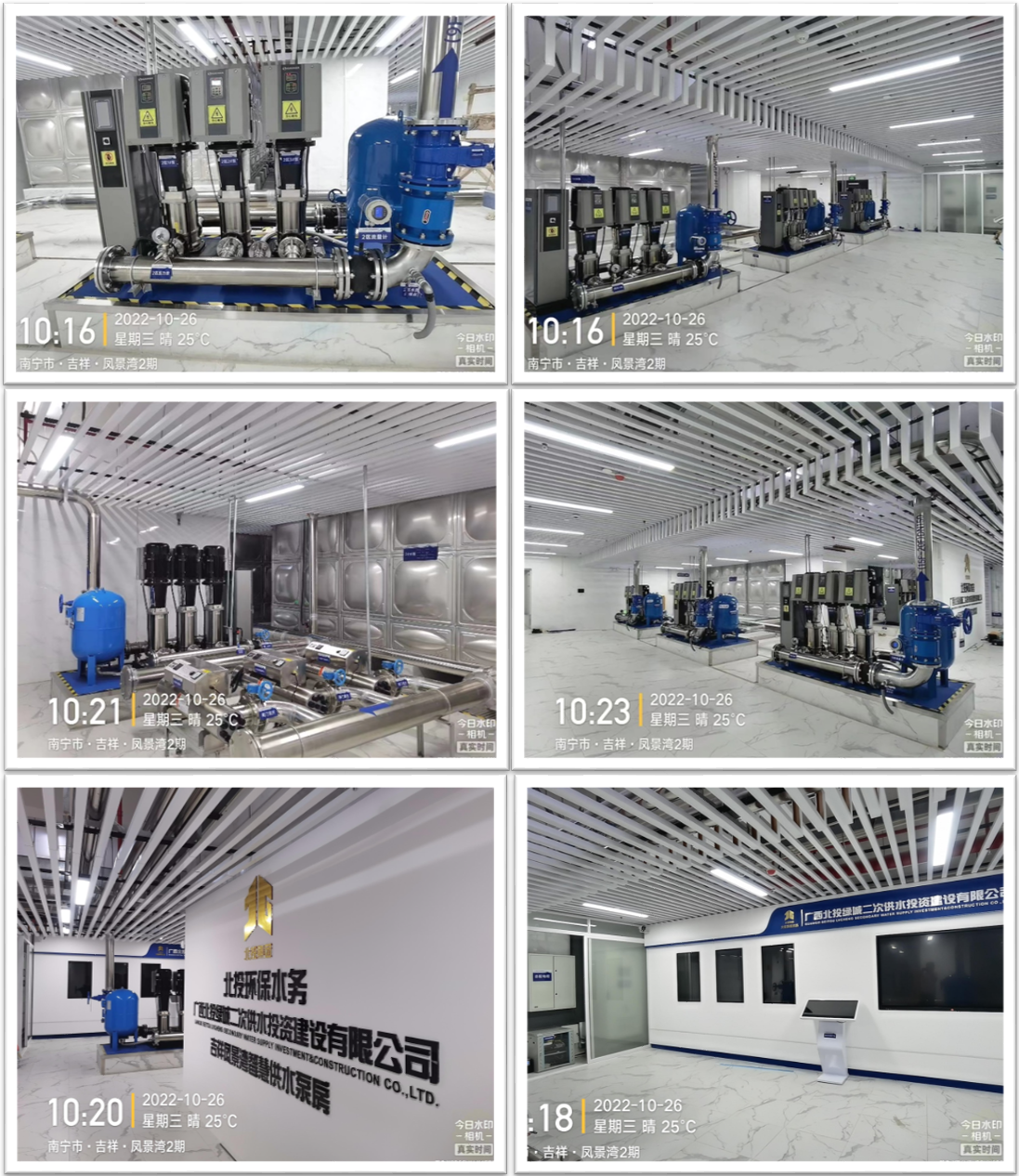 2022年南寧市新建小區(qū)吉祥·鳳景灣二期二次加壓供水設(shè)備項(xiàng)目,一共配備了11套五代設(shè)備,設(shè)備系統(tǒng)流量28-70 m3/h,揚(yáng)程48-135m,以低能耗滿(mǎn)足6000余戶(hù)的供水需求。