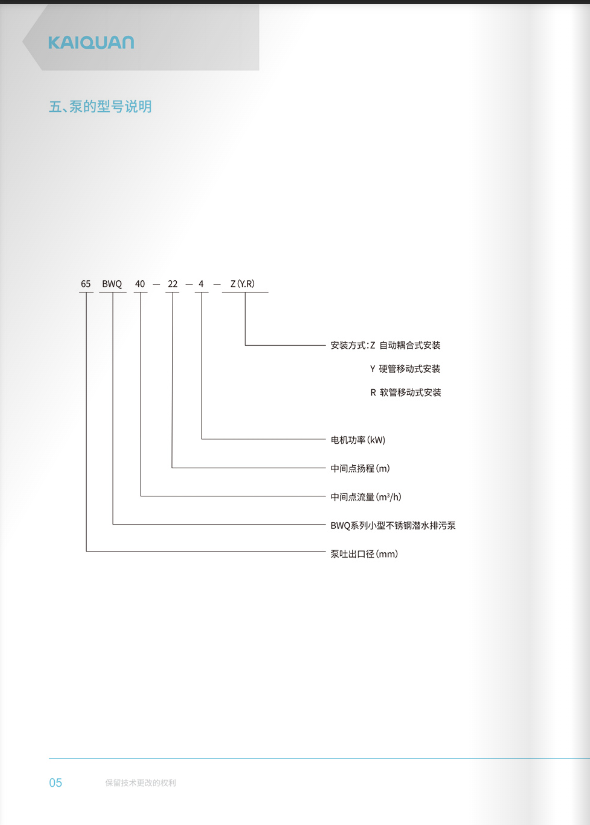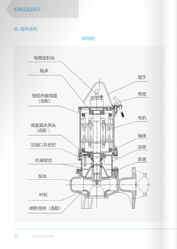 上海凱泉新推出的7.5KV及以下全不銹鋼污水污物潛水電泵,采用不銹鋼精密鑄造,具有耐腐蝕,能應(yīng)對一般腐蝕性工況,吸收了國內(nèi)外同類產(chǎn)品的優(yōu)點(diǎn),集凱泉公司產(chǎn)品在市場上多年來的使用經(jīng)驗(yàn),在水力模型、機(jī)械結(jié)構(gòu)及密封等方面進(jìn)行了綜合優(yōu)化設(shè)計(jì),更高效節(jié)能,更安全可靠性;產(chǎn)品結(jié)構(gòu)簡化,拆裝、維護(hù)、控制更容易,更經(jīng)濟(jì)實(shí)用;安裝方式多樣,簡化泵站,節(jié)省投資。